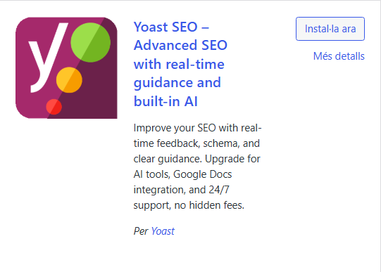 SEO i posicionament INSTAL·LAR EXTENSIÓ YOAST SEO Anem a extensions. Instal·lat aquesta extensió COM ACTIVAR EL SEO